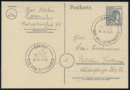 7256 | 12 € | 4300 Essen Sonder- u. Handwerbe-Stempel : ESSEN 1/ TAG DER BRIEFMARKE 1947 (26.10.) SSt (Brieftaube) auf Inl.-Karte (Bo.43) | ![]() | |