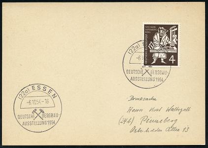 7260 | 18 € | 4300 Essen Sonder- u. Handwerbe-Stempel : (22a) ESSEN/ DEUTSCHE BERGBAU-/ AUSSTELLUNG 1954 1954 (29.9.) SSt (Hammer, Eisen) + mitivgl. Ausstellungs-Vignette (EF 4 Pf. Gutenberg, Mi.198 EF + 45.- EUR) klar gest. Inl.-Drs.-Karte (Bo.76) | ![]() | |