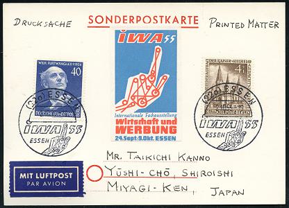 7261 | 25 € | 4300 Essen Sonder- u. Handwerbe-Stempel : (22a) ESSEN/ iWA 55 1955 (1.10.) SSt = i nternat. Werbe-Ausstellung (= mechanische Roboter-Hand) 2x + motivgl. Ausst.-Vignette, klar gest. Übersee-Flp.-Karte mit besserer Berlin-Frankatur (Mi.106, 128 + 55.- EUR) n. Japan (Bo.77) | ![]() | |