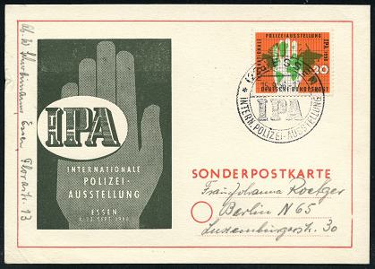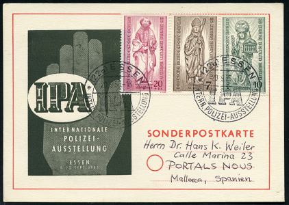 7263 | 20 € | 4300 Essen Sonder- u. Handwerbe-Stempel : (22a) ESSEN/ IPA/ INTERN.POLIZEI-AUSSTELLUNG 1956 (Sept.) SSt 2x auf Berlin-Frankatur "25 Jahre Bistum" (Mi.132/34 + 21.- EUR) klar gest. monochromer Sonder-Kt.: I.P.A. (Michaelis Nr.8, + 30.-DM, 1991) Ausl.-Karte (Bo.86) | ![]() | |