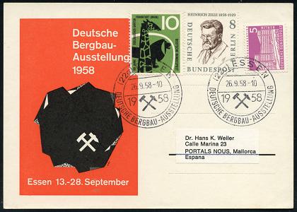 7265 | 18 € | 4300 Essen Sonder- u. Handwerbe-Stempel : (22a) ESSEN/ DEUTSCHE BERGBAU-AUSSTELLUNG 1958 (28.9.) SSt (Hammer u. Eisen) auf Ausstellungs-Sonder-Kt. (Michaelis Nr.10) Ausl.-Kt. (Bo.97) | ![]() | |