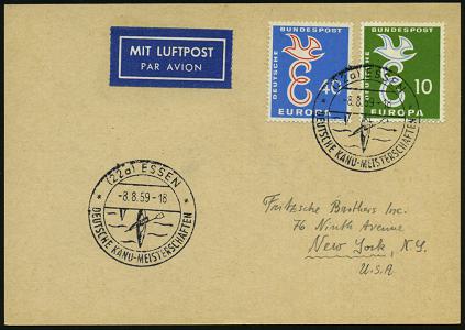 7267 | 18 € | 4300 Essen Sonder- u. Handwerbe-Stempel : (22a) ESSEN/ DEUTSCHE KANU-MEISTERSCHAFTEN 1959 (8.8.) SSt = Kajak Einer , 2x klar gest. Übersee-Flp.-Kt. n. U.S.A. (Bo.106) | ![]() | |