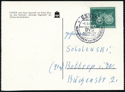 7268 | 15 € | 4300 Essen Sonder- u. Handwerbe-Stempel : ESSEN/ DVS/ FACHSCHAU/ SCHWEISSEN UND SCHNEIDEN 1961 (3.9.) SSt auf Reklame-Ak.: Allianz-Versicherung (Deutsche Vogelwelt, die Elster) Inl.-Karte Übersee-Flp.-So.Kt.! (Bo.132) | ![]() ![]() | |