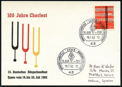 7270 | 18 € | 4300 Essen Sonder- u. Handwerbe-Stempel : 43 ESSEN/ HUNDERTJAHRFEIER DEUTSCHER SÄNGERBUND 1962 (19.7.) SSt = Violinsschlüssel auf Sonder-Kt.: 15. Deutsches Sängerbundesfest (Stimmgabeln) passende EF 20 Pf. "Lied & Chor" (Mi.380 EF), Ausl.-Karte (Bo.140) | ![]() | |