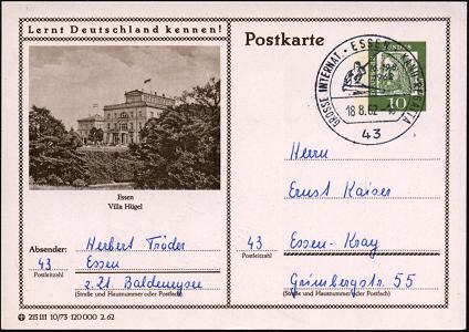 7273 | 16 € | 4300 Essen Sonder- u. Handwerbe-Stempel : 43 ESSEN/ GROSSE INTERNAT.KANU-REGATTA 1962 (18.8.) SSt = Kajak-Einer auf ortsgleicher BiP 10 Pf. Dürer: Essen Villa Hügel (Mi.P 72) Ortskarte, seltene Kombination! (Bo.141) | ![]() | |