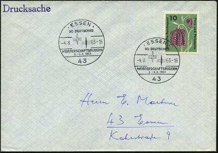 7275 | 12 € | 4300 Essen Sonder- u. Handwerbe-Stempel : 43 ESSEN/ 50.DEUTSCHES/ MEISTERSCHAFTSRUDERN 1963 (4.8.) SSt = 2 Vierer (im Zieleinlauf) klar gest. Orts-Bf. (Bo.153 , Finaltag) | ![]() | |