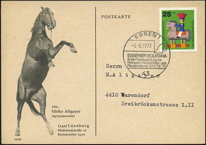 7279 | 16 € | 4300 Essen Sonder- u. Handwerbe-Stempel : 43 ESSEN 1/ ESSENER EQUITANIA/ Fachausstellung für/ Reitsport/ ..Pferdehaltung 1972 (1.5.) SSt = stilis. Pferdekopf , klar gest. Pferdemotiv-Kt.: Mirko Altgayer Agrarjournalist, seltene Kombination! (Bo.294) | ![]() | |