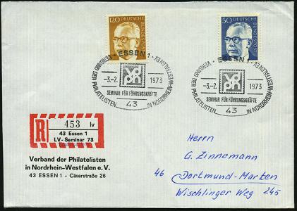 7280 | 18 € | 4300 Essen Sonder- u. Handwerbe-Stempel : 43 ESSEN 1/ VERBAND DER PHILATELISTEN/ SEMINAR FÜR FÜHRUNGSKRÄFTE.. 1973 (3.2.) SSt 2x + im Umschlag gedruckter SRZ: 43 Essen 1/l v/LV-Seminar 73 , Vordruck-Bf.: Verband der Philatelisten.., klar gest. Inl.-R-Bf. | ![]() | |