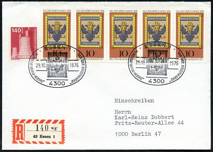 7281 | 18 € | 4300 Essen Sonder- u. Handwerbe-Stempel : 4300 ESSEN 1/ TAG DER BRIEFMARKE 1976 (29.10.) SSt (Postwappen) auf 5er-Streifen Tag der Briefmarke 10 Pf. etc., Inl.-R-Bf (Mi.903 etc.) | ![]() | |