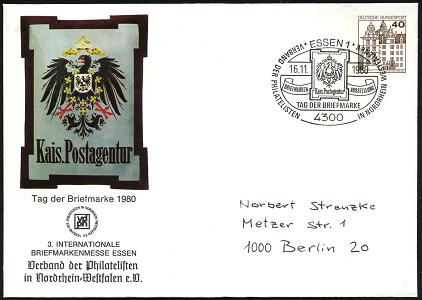 7283 | 8 € | 4300 Essen Sonder- u. Handwerbe-Stempel : 4300 ESSEN 1/ ..TAG DER BRIEFMARKE 1980 (16.11.) SSt = histor. kaiserl. Postschild auf motivgl. PU 40 Pf. Burgen, braun: Tag der Briefmarke (Mi.PU 111/43 = 3. Briefmarken-Messe) Inl.-Bf. (Bo.500) | ![]() | |