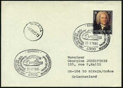 7287 | 8 € | 4300 Essen Sonder- u. Handwerbe-Stempel : 4300 ESSEN 1/ Ausstellungszug../ 150 Jahre..DEUTSCHE EISENBAHN 1985 (27.7.) SSt = ICE-Lok , klar gest. Ausl.-Karte (Bo.645) | ![]() | |