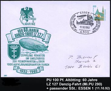 7289 | 10 € | 4300 Essen Sonder- u. Handwerbe-Stempel : 4300 ESSEN 1/ VOR 60 JAHREN/ DANZIG-FAHRT LZ 127.. 1992 (11.10.) SSt = Zeppelin über Danzig auf PU 100 Pf. Bauwerke: .. DANZIG-FAHRT LZ 127 (Mi.PU 290) Inl.-Bf. | ![]() | |