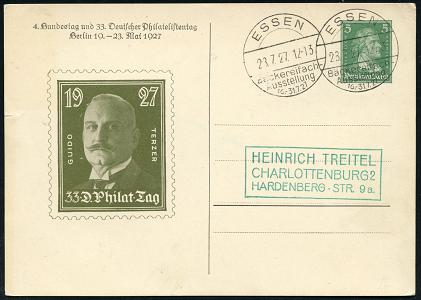 7242 | 35 € | 4300 Essen Sonder- u. Handwerbe-Stempel : ESSEN/ Bäckereifach-/ Ausstellung/ 16.-31./ . 1927 (28.7.) seltener SSt 2x auf PP 5 Pf. Schiller, grün: 33. D. Philat.-Tag (Guido Terzer, Mi.PP 101/C 3-010) Inl.-Karte (Bo.14) | ![]() | |