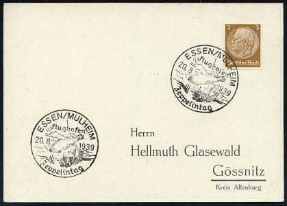 7251 | 18 € | 4300 Essen Sonder- u. Handwerbe-Stempel : ESSEN-MÜLHEIM/ Flughafen/ Zeppelintag 1939 (20.8.) SSt = Zeppelin (über Grubenanlage mit Förderturm) klar gest. Inl.-Drs.-Karte (Bo.35) | ![]() | |