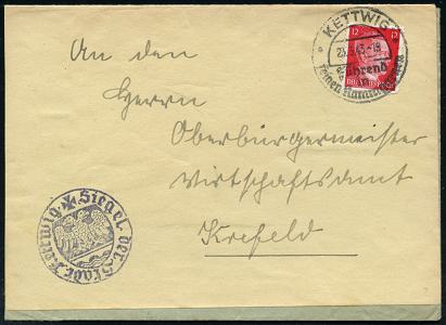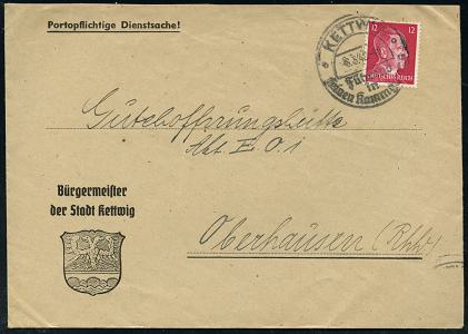 7253 | 18 € | 4300 Essen Sonder- u. Handwerbe-Stempel : Essen-Kettwig 1942 (6.3.) HWSt.: KETTWIG/Führend/in/feinen Kammgarnen auf EF 12 Pf. Hitler , illustrierter Dienst-Bf.: Bürgermeister der Stadt Kettwig mit Stadtwappen (Bo.2) | ![]() | |