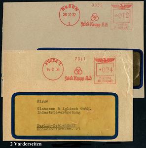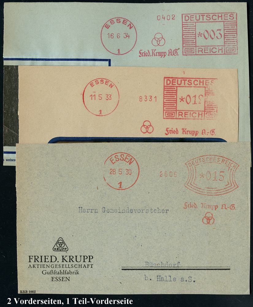 7384 | 60 € | 4300 Essen Absender-Freistempel : ESSEN/ 1/ Friedr.Krupp AG. 1930/38 5 verschiedene AFS Francotyp"Bogenrechteck", "Mäanderrechteck" u. "Reichsadler" (je Krupp-Logo: 3 Ringe) 3 Bedarfs-Vorderseite u.. Teil-Vorderseiten, 5 Belege = Deutschlands berühmteste Waffenschmiede! (Dü.E-1Am, E-2A, E-5A) | ![]() ![]() | |