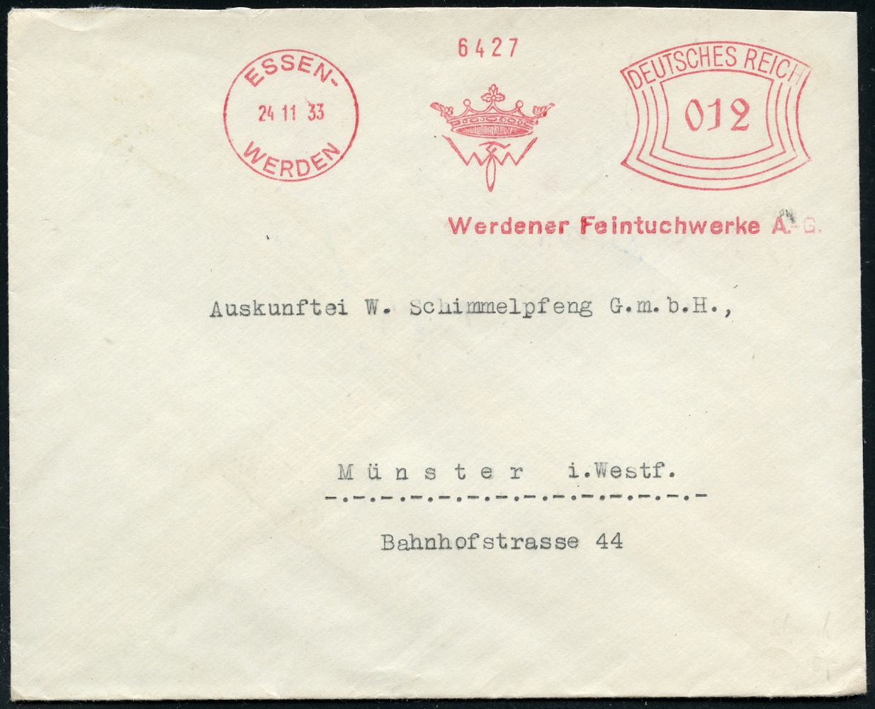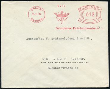 7385 | 25 € | 4300 Essen Absender-Freistempel : ESSEN-/ WERDEN/ Werdener Feintuchwerke AG. 1933 (24.11.) dekorativer AFS Francotyp "Bogenrechteck" (Monogr. mit Krone) rs. motivg. Abs.-Vordruck (rs. beschriftet) klar gest. Fern-Bf. (Dü.E-1CEh) | ![]() | |