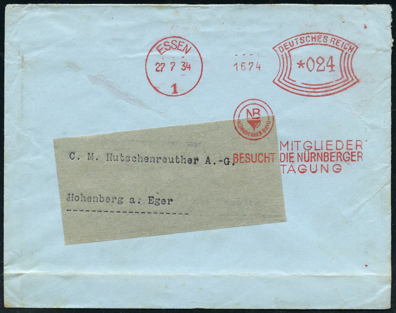 7391 | 25 € | 4300 Essen Absender-Freistempel : ESSEN/ 1/ NÜRNBERGER BUND/ MITGLIEDER/ BESUCHT DIE NÜRNBERGER/ TAGUNG 1934 (27.7.) AFS Francotyp "Bogenrechteck" (= "Nürnberger Trichter") Fernbf. (unten Querfalte) klar gest.!, seltener Beleg! (Dü.E-1Am) | ![]() | |