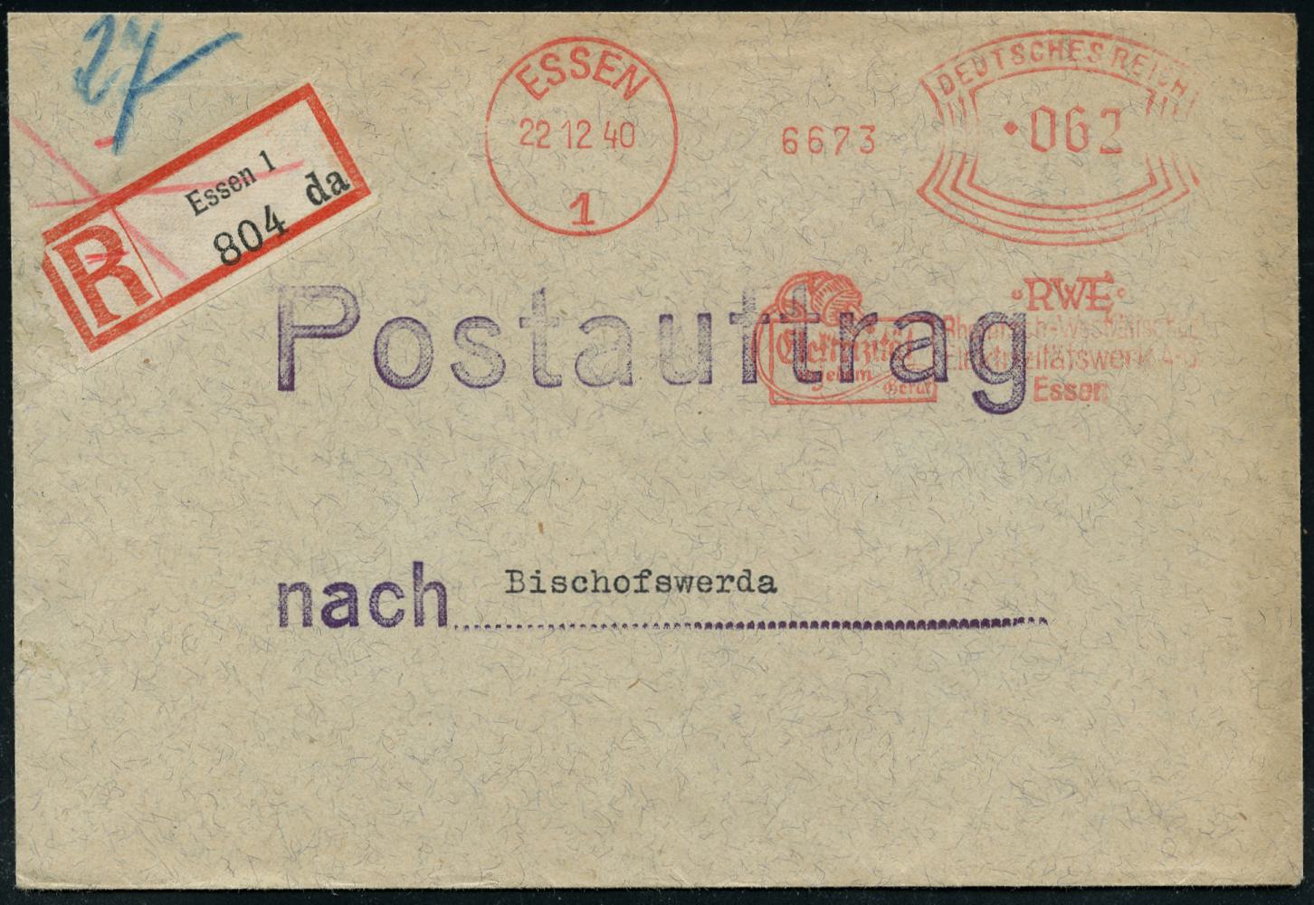 7395 | 25 € | 4300 Essen Absender-Freistempel : ESSEN/ 1/ RWE/ Rhein.-Westf./ Elektrizitätswerke/ Elektrizität/ in jedem/ Gerät 1940 (22.12.) AFS Francotyp "Bogenrechteck" 062 Pf. (Stecker mit Kabel) minim.undeutl., rs. Abs.-Vordruck + Firmen-RZ: Essen 1 /d a (kl. Eckfehler), Postauftrags-R-Bf., seltenes Porto! (Dü.E-1AGm / Dü.45m = seltene Type!) | ![]() ![]() | |