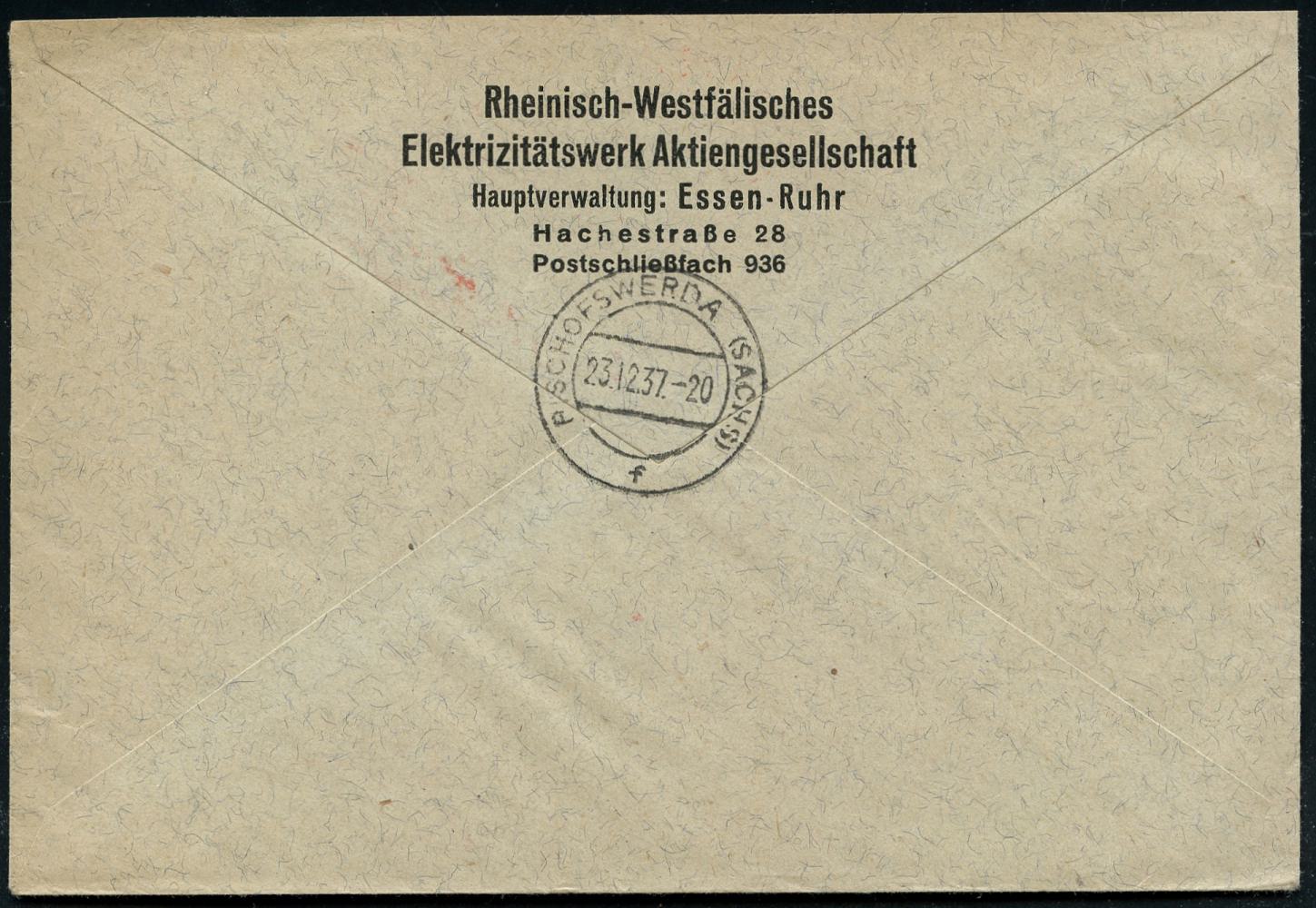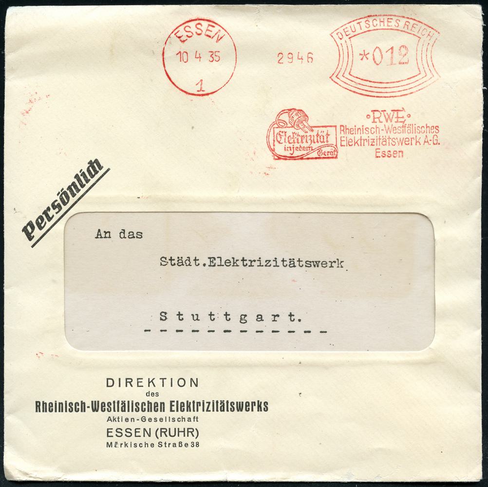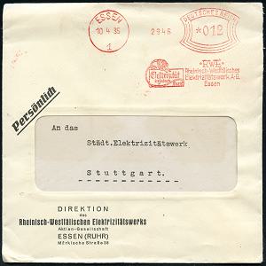 7386 | 22 € | 4300 Essen Absender-Freistempel : ESSEN/ 1/ RWE/ Rheinisch-Westfäl./ Elektrizitätswerk AG/ Elektrizität/ in jedem/ Gerät 1935 (10.4.) AFS Francotyp "Bogenrechteck" /Stecker mit Kabel) Firmen-Bf.: DIREKTION des Rhein.-Westfäl. Elektrizitätswerks AG.. (oben minim. Rißchen) Fern-Bf. (Dü.E-1Am) | ![]() | |