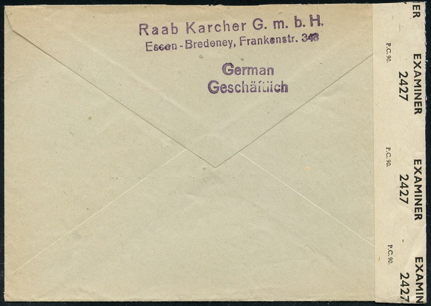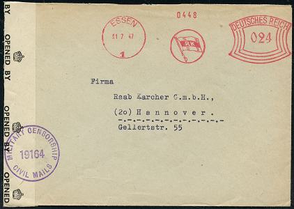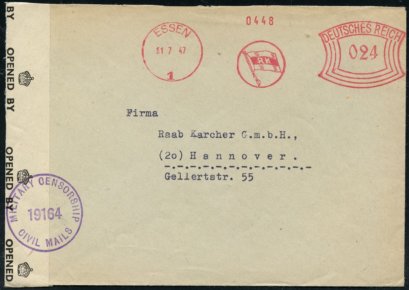 7410 | 28 € | 4300 Essen Absender-Freistempel : ESSEN/ 1/ RK 1947 (1.7.) AFS Francotyp "Bogenrechteck" mit Inschrift DEUTSCHES REICH unverändert weiterverwendet = Notmaßnahme! , R K = Fa. Raab Karcher mit Firmen-Flagge + brit. Zensur-1K "19164" + Streifen: Nr.P.C.90/2427 (= Bonn) , Inl.-Zensur-Bf. n. Hannover (Dü.E-1CEh unverändert weiterverwendet) | ![]() ![]() | |