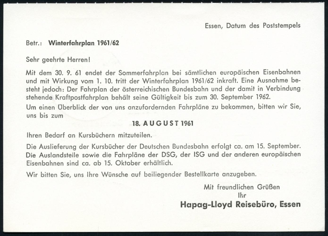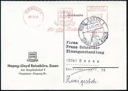 7425 | 14 € | 4300 Essen Absender-Freistempel : (22) ESSEN 1/ HAPAG/ LLOYD/ REISEBÜRO/ für alle Reisen 1961 (7.8.) AFS Francotyp (Logo) auf motivgl. Firmen-Kt. mit rs. Text über europ. Winterfahrplan, Bundesbahn-Kursbücher etc. + HWSt.: (22 a) ESSEN 1/e/STADT DER KOHLE, nachgesandte Orts-Kt. | ![]() ![]() | |