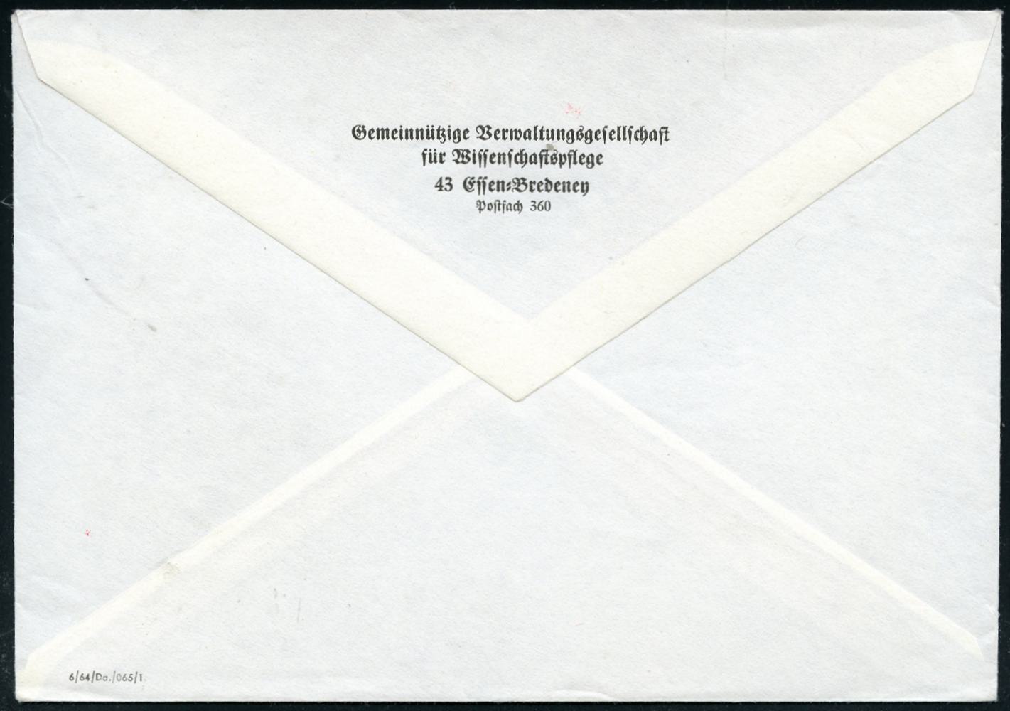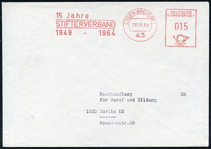 7430 | 18 € | 4300 Essen Absender-Freistempel : 43 ESSEN-BREDENEY/ 15 Jahre/ STIFTERVERBAND/ 1949-1964 1964 (20.10.) seltener Jubil.-AFS , rs. Abs.-Vordruck: Gemeinnützige Verwaltungsgesellschaft für Wissenschaftspflege, Inl.-Bf. n. West-Berlin (Dü.E-26) | ![]() ![]() | |