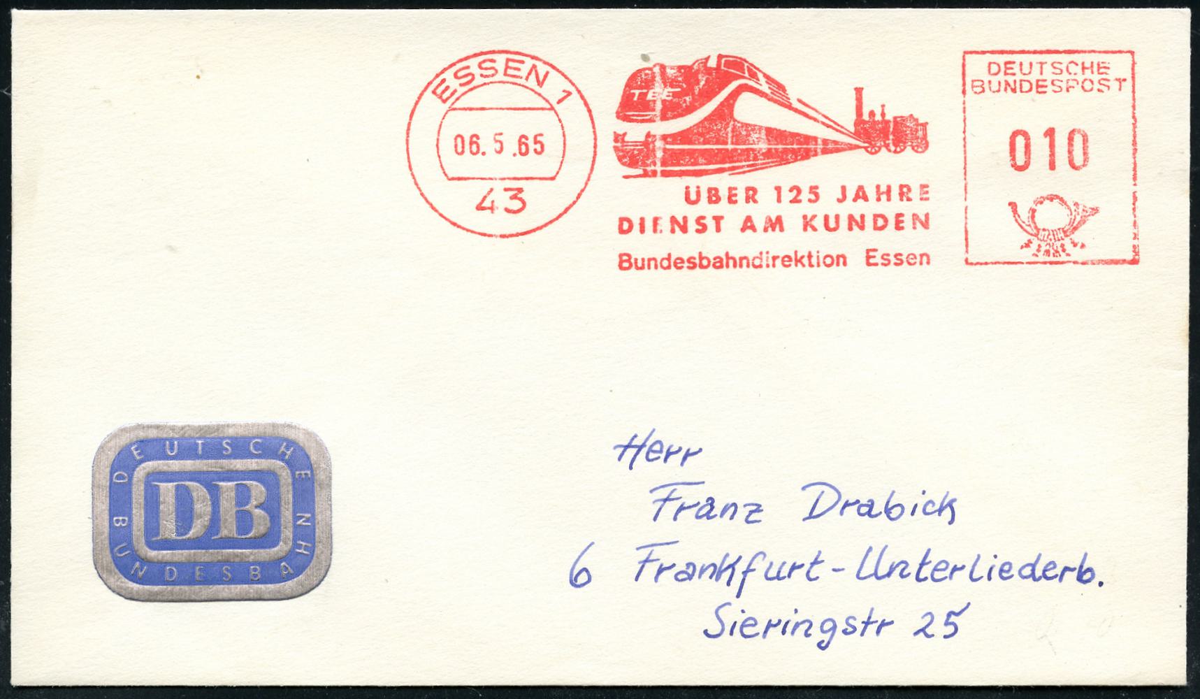 7434 | 18 € | 4300 Essen Absender-Freistempel : 43 ESSEN 1/ ÜBER 125 JAHRE/ DIENST AM KUNDEN/ Bundesbahndirektion Essen 1965 (6.5.) Jubil.-AFS Francotyp (TEE-Diesellok u. Zug, histor. Dampflok "Adler") + DB-Vignette (bla/silber) Fern-Bf. (Dü.E-23CO) | ![]() | |