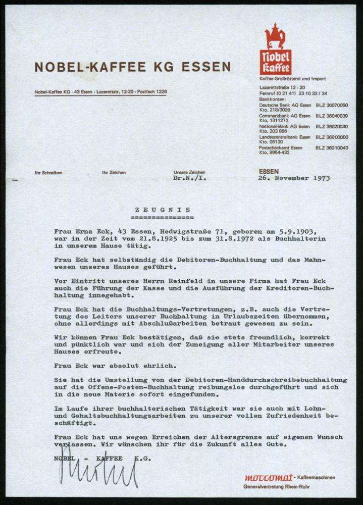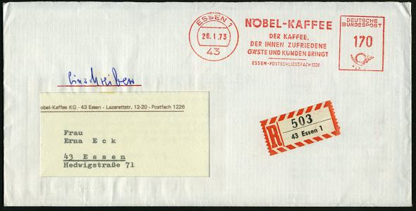 7438 | 20 € | 4300 Essen Absender-Freistempel : 43 ESSEN 1/ NOBEL-KAFFEE.. 1973 (26.1.) AFS Francotyp 170 Pf. + RZ: 43 Essen 1 , Firmen-R-Bf. + Inhalt, 2 dekorative Briefbogen, dabei Mitarbeiter-Zeugnis!, 3 Belege kompl.! (Dü.E-23) | ![]() ![]() | |