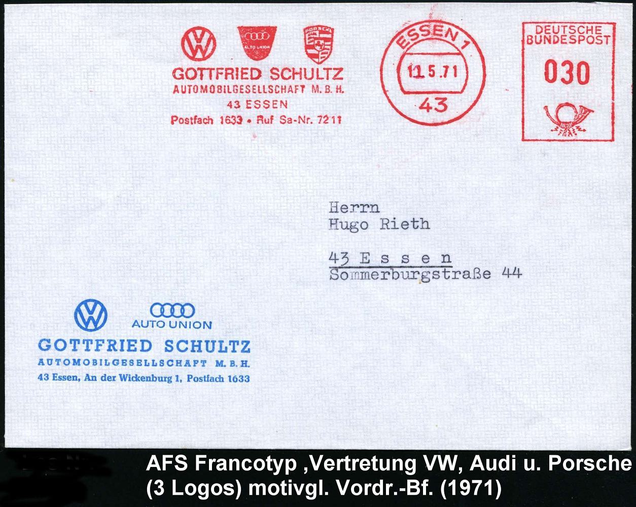 7437 | 14 € | 4300 Essen Absender-Freistempel : 43 ESSEN 1/ VW AUTO UNION PORSCHE/ GOTTFRIED SCHULTZ.. 1971 (12.5.) AFS Francotyp mit Firmen-Logo von VW, Audi u. Porsche , motiv-ähnl. Firmen-Fernbf. (Dü.E-26) | ![]() | |