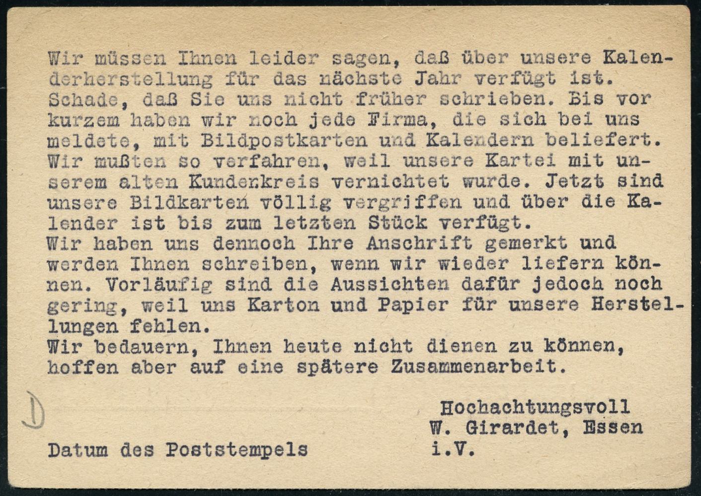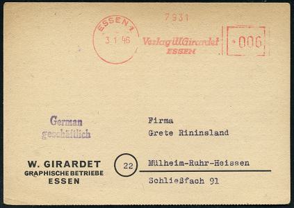 7399 | 28 € | 4300 Essen Absender-Freistempel : ESSEN 1/ Verlag W.Girardet 1946 (3.1.) aptierter AFS Francotyp "Reichsadler" = entfernt + Inschrift entfernt = Notmaßnahme! , Firmen-Kt.: W. GIRARDET, GRAPHISCHE BETRIEBE, Text: "..Bildkarten völlig vergriffen..wenn wir wieder liefern können..weil und Karton u. Papier..fehlen" n. Mülheim/ Ruhr, Zeitgeschichte! (Dü.E-13 AT-147h, = seltene Type) | ![]() ![]() | |