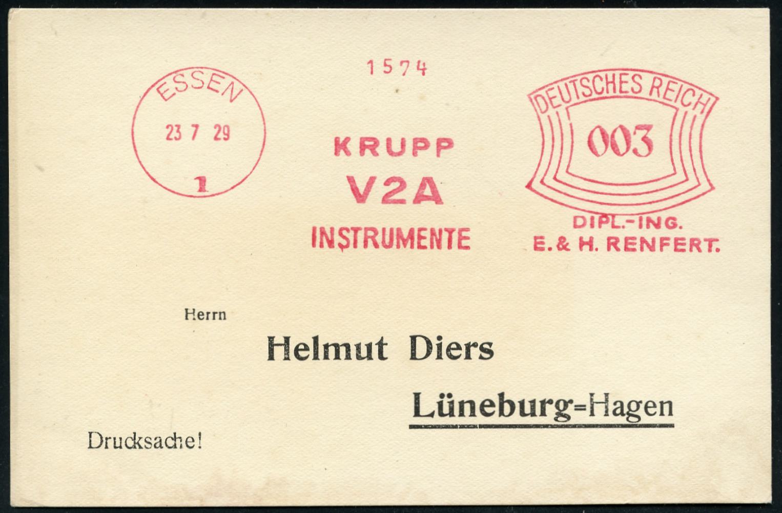 7382 | 25 € | 4300 Essen Absender-Freistempel : ESSEN/ 1/ KRUPP/ V2A/ INSTRUMENTE/ DIPL.-ING./ E. & H.RENFERT 1929 (23.7.) AFS Francotyp "Bogenrechteck" klar auf Drs.-Karte (Dü.E-CAh = frühe C-Maschine !) | ![]() | |