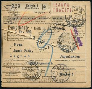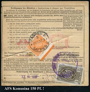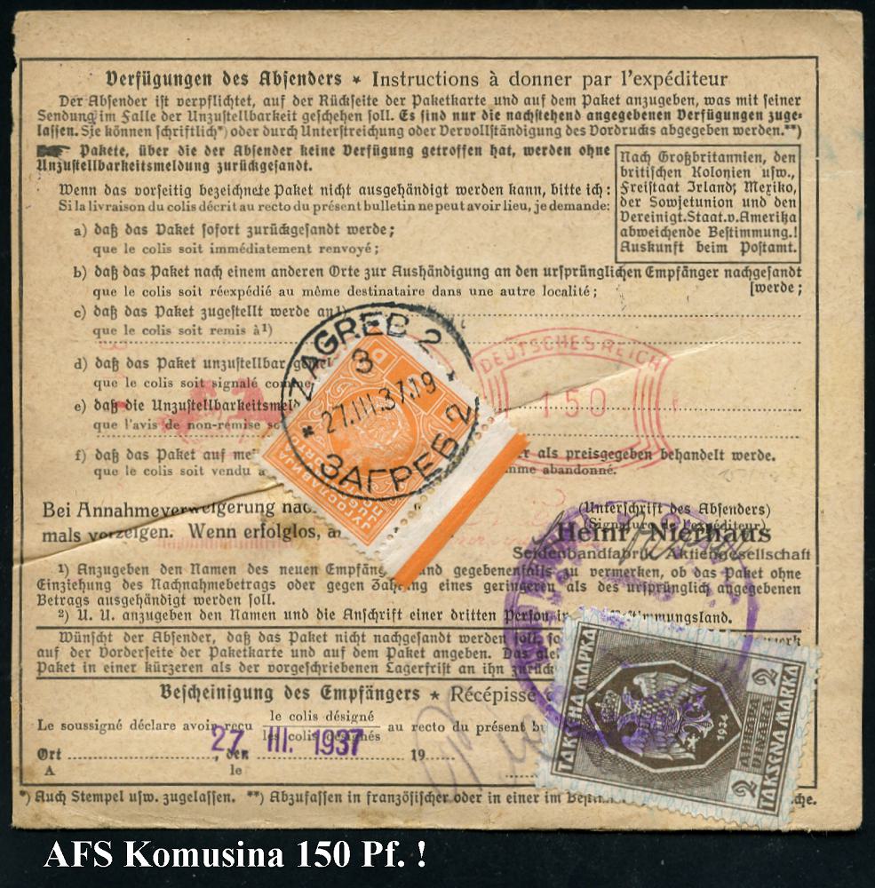 7387 | 35 € | 4300 Essen Absender-Freistempel : Essen-Kettwig 1937 (13.3.) AFS Komusina "Bogenrechteck": KETTWIG/***/ Heinr. Nierhaus/Seidenbandfabrik AG 150 Pf. rs. + schw. Selbstbucher-Paketzettel: Kettwig 1/ Heinz Nierhaus (Ort durch jugoslaw. Portomarke verdeckt) + HWSt.: KETTWIG/ Führend in/feinen Kammgarnen (Bo.1) + amtl., viol. 1L: Gebühr umseitig, Ausl.-Selbstbucher-Paket-Kt. (Querfalte) n. Zagreb, rs. jugoslaw. Fiskal- u. Portomarken!, seltener Beleg! (Dü.E-1 Komusina, vergl. Kat.-Nr. 7388) | ![]() ![]() | |