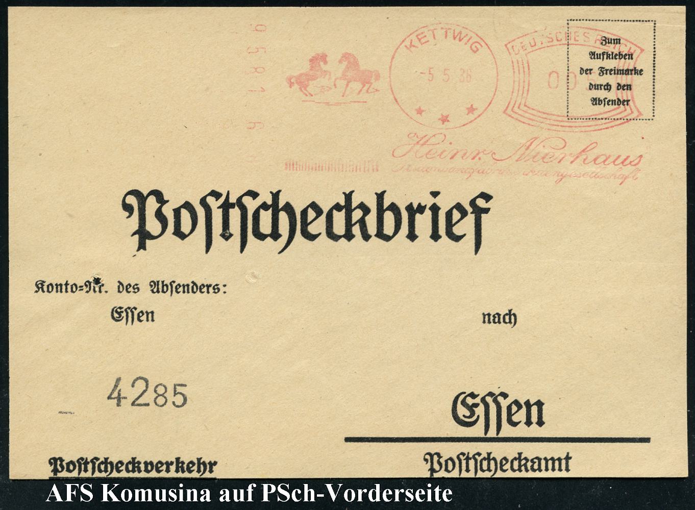 7388 | 25 € | 4300 Essen Absender-Freistempel : Essen-Kettwig 1936 (5.5.) AFS Komusina "Bogenrechteck": KETTWIG/***/ Heinr. Nierhaus/ Seidenbandfabrik AG (Logo: 2 Pferde) 005 Pf. auf kleiner Postscheck-Vorderseite = Sonderporto!, seltener Beleg!, vergl. Kat.-Nr.7387 (Dü.E-1 Komusina = Spätverwendung!) | ![]() | |