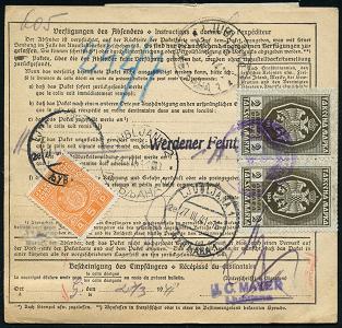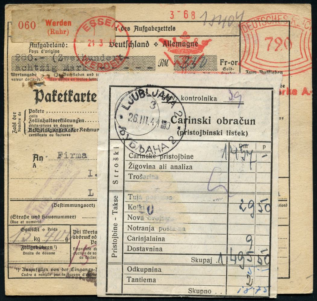 7396 | 35 € | 4300 Essen Absender-Freistempel : ESSEN-/ WERDEN/ Werdener Feintuchwerke 1941 (21.3.) AFS Francotyp "Bogenrechteck" 720 Pf. (Firmen-Logo) + roter Paket-Wertzettel: Werden/ (Ruhr), Inl.-Wertpaket-Kt. (kl. Ausriß) n. Ljubljana (AS) mit Gebührenzettel + rs. jugoslaw. Tax- u. Fiskalmarken, kurz vor dem Angriff der Wehrmacht auf Jugoslawien!, sehr seltene Portostufe!, vergl. Kat.-Nr.7385 (Dü.E-1CEh) | ![]() ![]() | |