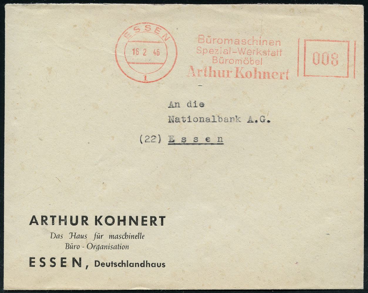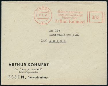 7401 | 25 € | 4300 Essen Absender-Freistempel : ESSEN/ 1/ Büromaschinen/ Spezial-Werkstatt/ Büromöbel/ Arthur Kohnert 1946 (16.2.) aptierter AFS Francotyp "Reichsadler" = entfernt + Inschrift = Notmaßnahme! , klar gest. Firmen-Orts-Bf. (Dü.E-13 AT-147o) | ![]() | |