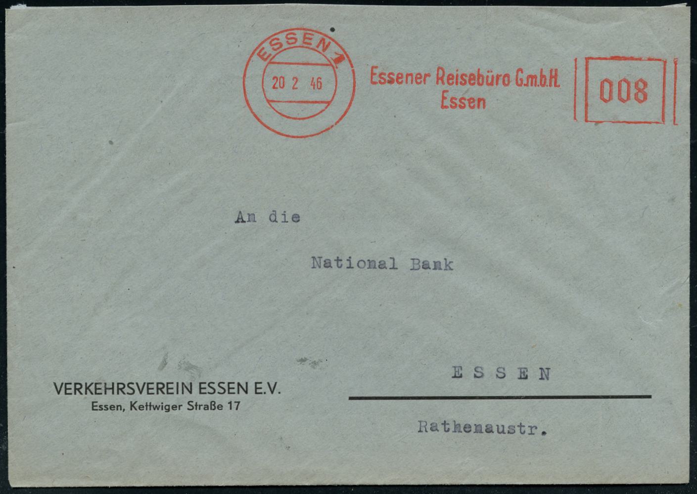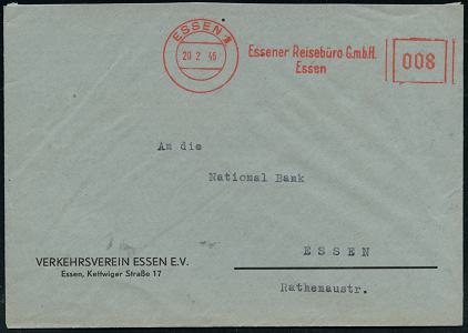 7402 | 25 € | 4300 Essen Absender-Freistempel : ESSEN 1/ Essener Reisebüro GmbH.. 1946 (20.2.) aptierter AFS Francotyp "Reichsadler" = entfernt + Inschrift = Notmaßnahme! , Orts-Bf.: VERKEHRSVEREIN ESSEN EV.. (Dü.E-13 AT-129o) | ![]() | |
