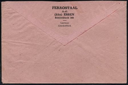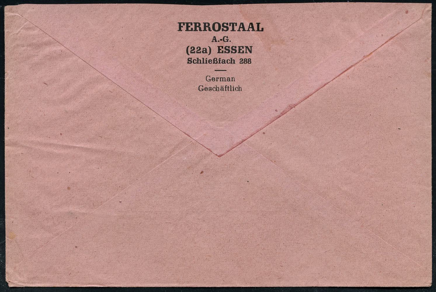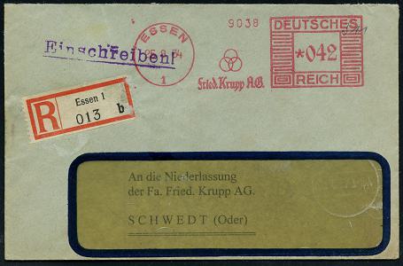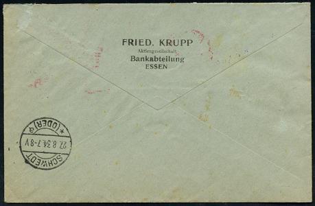 7392 | 25 € | 4300 Essen Absender-Freistempel : ESSEN/ 1/ Fried. Krupp A.-G. 1934 (25.8.) AFS Francotyp "Mäanderrechteck" 042 Pf. (Logo = 3 Ringe) + RZ: Essen 1/b (kl. Randmäng.) Firmen-Bf.: Fried. Krupp AG, Bankabteilung (rs. Abs.-Vordruck), Inl.-R-Bf. = Deutschlands größte Waffenschmiede! (Dü.E-2Am) | ![]() ![]() | |