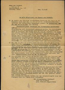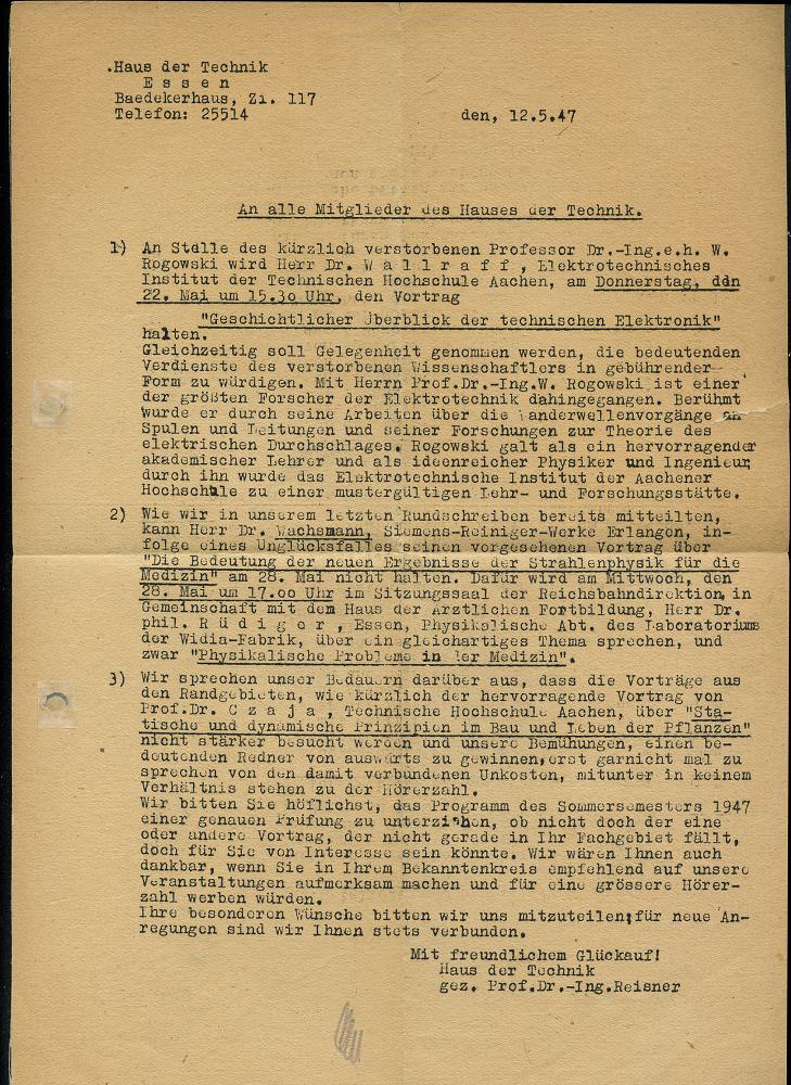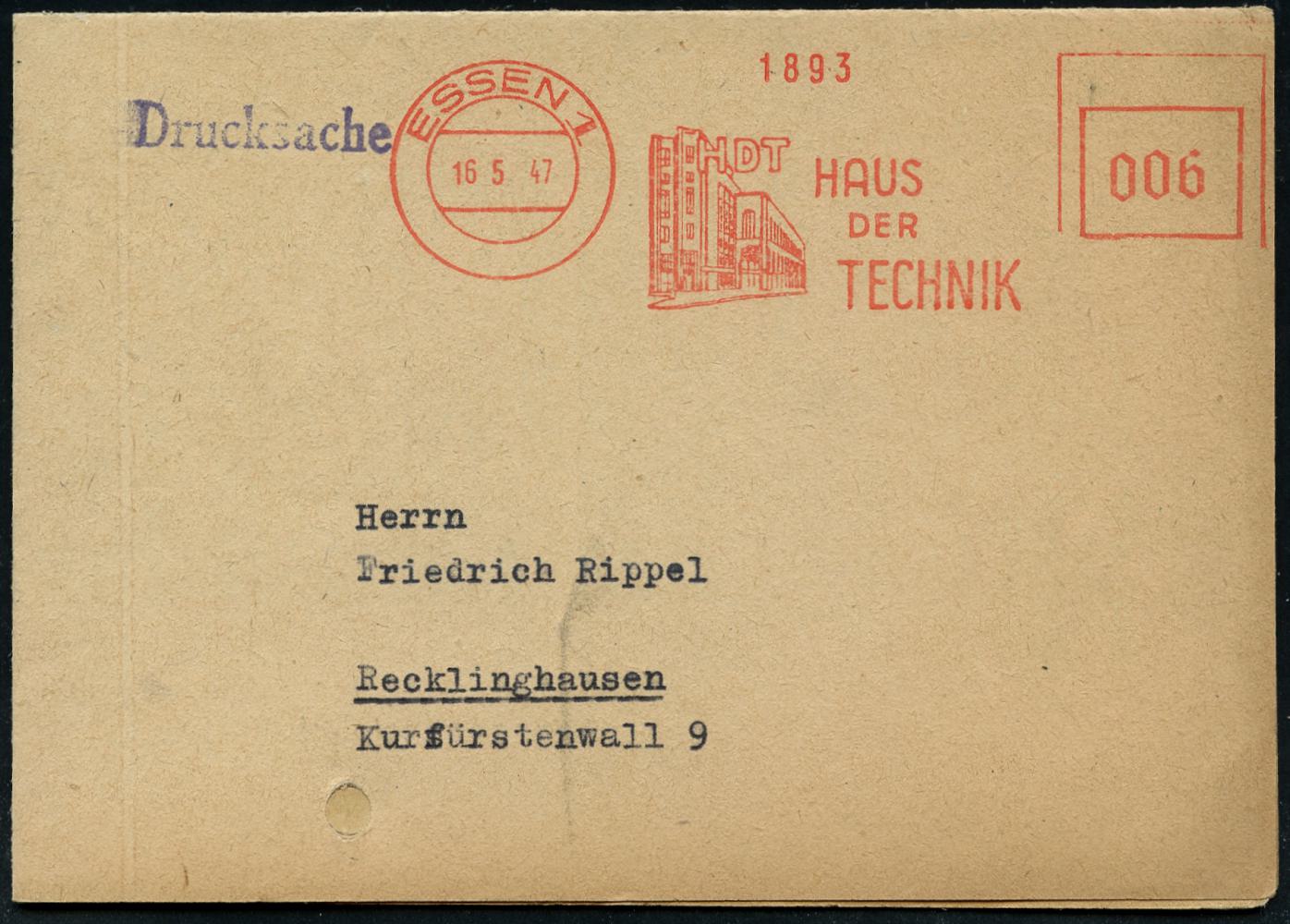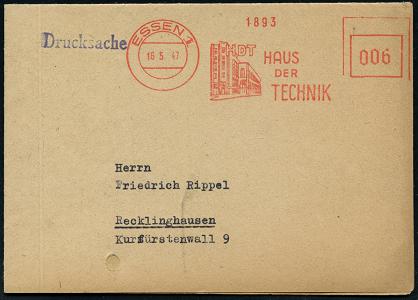 7409 | 20 € | 4300 Essen Absender-Freistempel : ESSEN 1/ HDT/ HAUS/ DER/ TECHNIK 1947 (16.5.) aptierter AFS Francotyp "Reichsadler" = entfernt + Inschrift = Notmaßnahme! (Haus der Technik) Falt-Bf. mit Inhalt (Reg.-Lochung + 1x Riß geschl.) Inhalt über den Vortrag "Geschichtlicher Überblick der technischen Elektronik" n. Recklinghausen (Dü.E-13-AM-129h) | ![]() ![]() | |