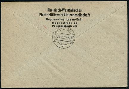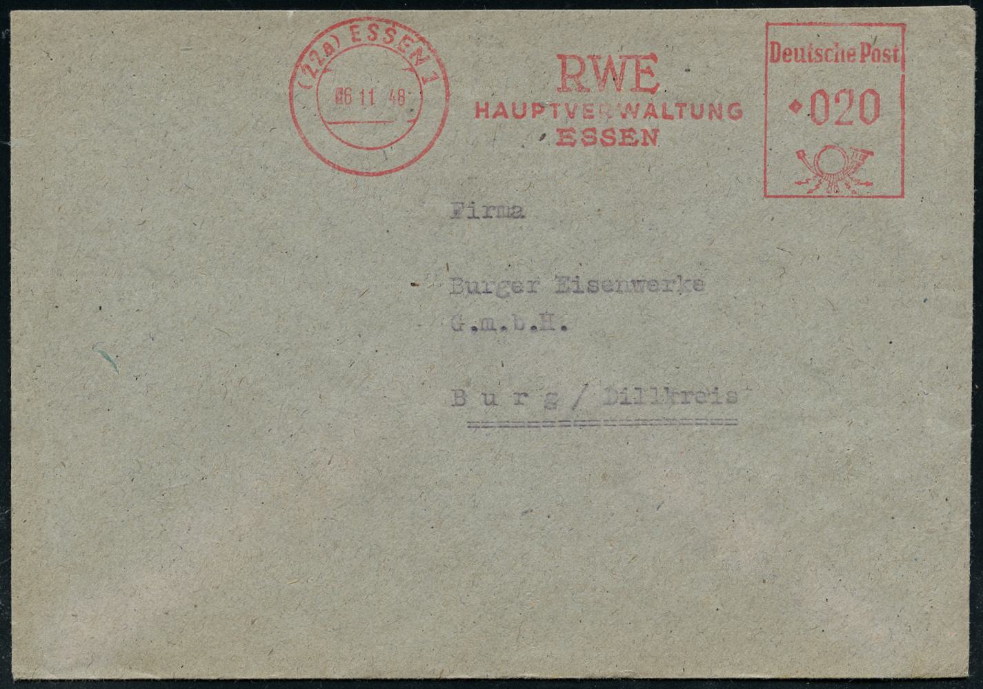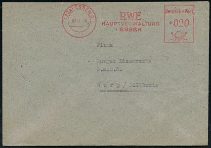 7413 | 16 € | 4300 Essen Absender-Freistempel : (22a) ESSEN 1/ RWE/ HAUPTVERWALTUNG.. 1947 (6.11.) AFS Francotyp "Posthorn" , rs. Abs.-Vordruck: Rhein.-Westfäl. Elektrizitätswerk AG.., Fern-Bf. (Dü.E-20CGo) | ![]() | |