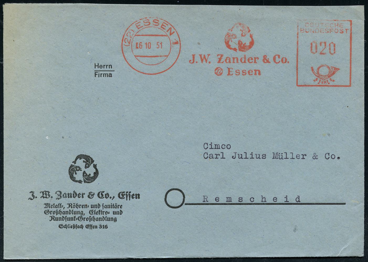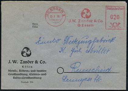 7414 | 22 € | 4300 Essen Absender-Freistempel : (22) ESSEN 1/ J.W.Zander & Co.. 1950/51 AFS Francotyp "Posthorn" mit Inschrift "Deutsche Post" bzw. "DEUTSCHE BUNDESPOST" (je Firmen-Logo: 3 Fische = Zander!) je auf motivgl. Firmen-Bf.: J. W. Zander & Co, Metall-, Röhren- u. sanitäre Großhandlung.., 2 Belege in Entwicklungsdarstellung (Dü.E-20CG, E-23CG) | ![]() ![]() | |