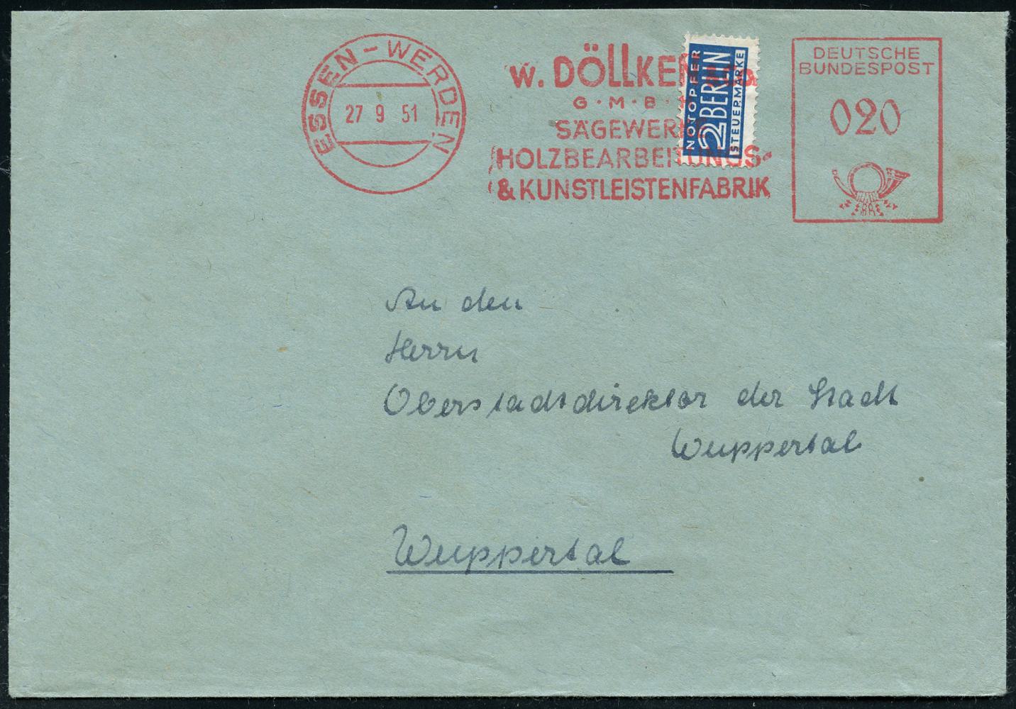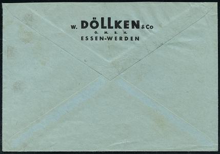7415 | 15 € | 4300 Essen Absender-Freistempel : ESSEN-WERDEN/ W.DÖLLKEM & CO/ ..SÄGEWERKE/ HOLZBEARBEITUNGS-/ & KUNSTLEISTENFABRIK 1951 (27.9.) AFS Francotyp "Posthorn" auf 2 Pf. NoB = Vorausentwertung , rs. Abs.-Vordruck, Fern-Bf. (Dü.E-23CEo = Erstjahr) | ![]() ![]() | |