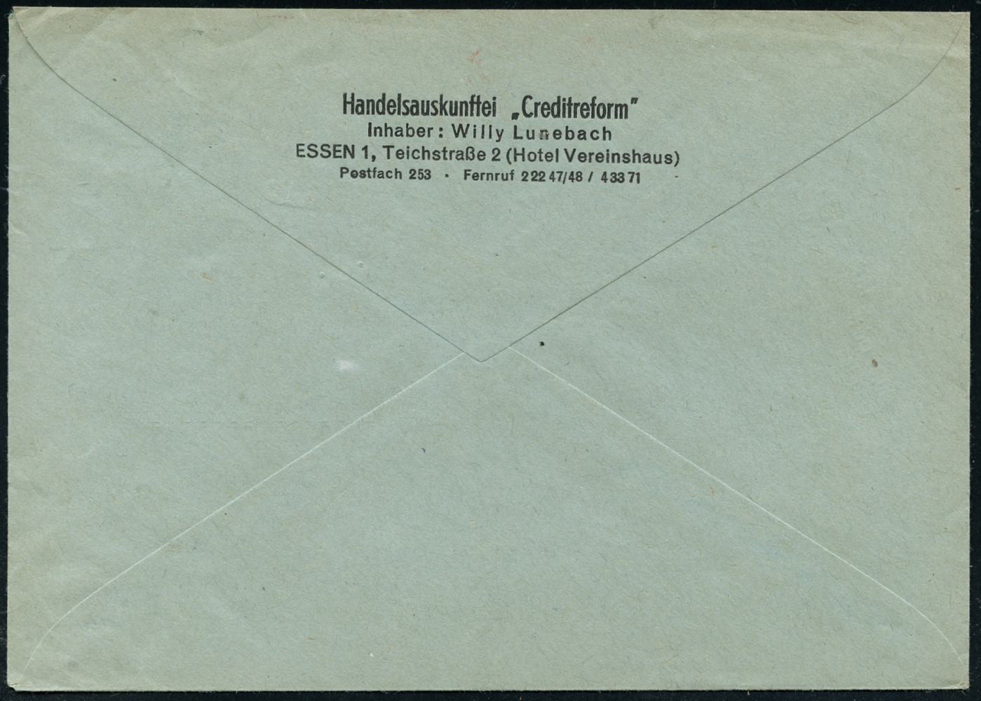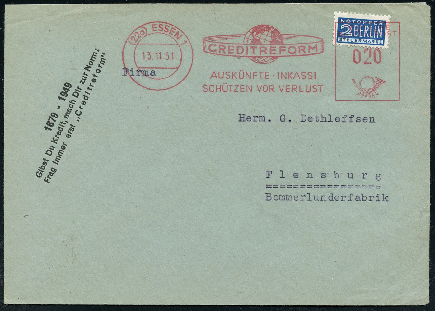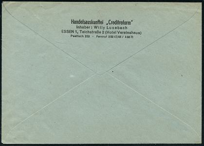 7416 | 16 € | 4300 Essen Absender-Freistempel : (22a) ESSEN 1/ CREDITREFORM/ AUSKÜNFTE-INKASSI/ SCHÜTZEN VOR VERLUST 1951 (13.11.) AFS Francotyp "Posthorn" auf 2 Pf. NoB = Vorausentwertung (Globus-Logo) Jubil.-Reklame-Bf. mit Sinnspruch, rs. Abs.-Vordruck, Fern-Bf. (Dü.E-23CGo = Erstjahr) | ![]() ![]() | |