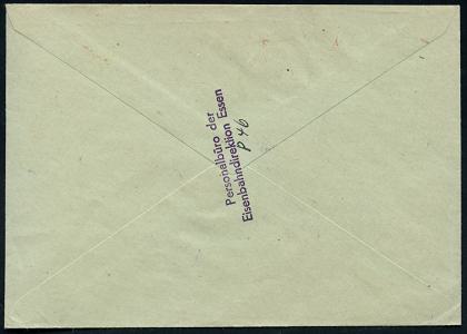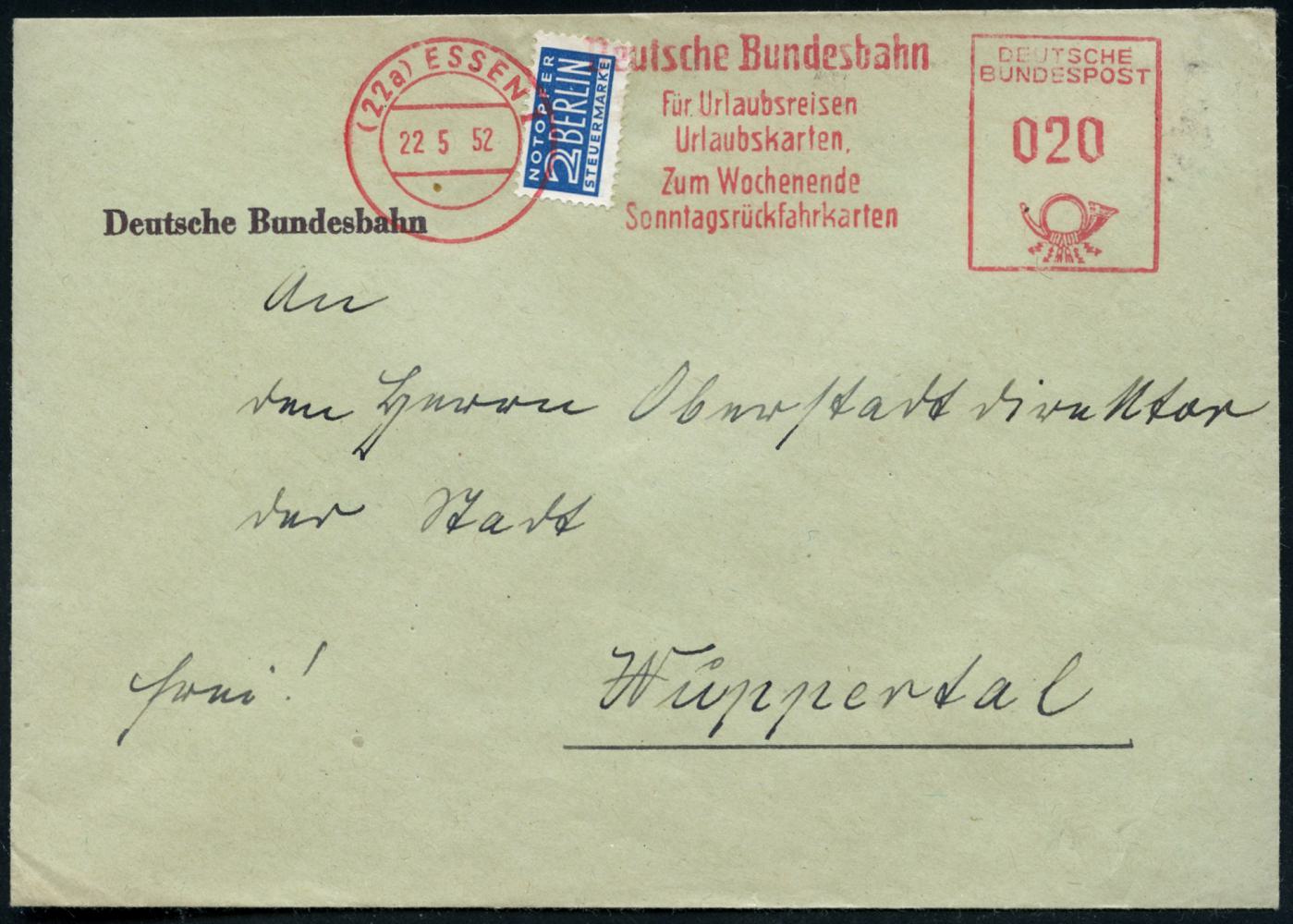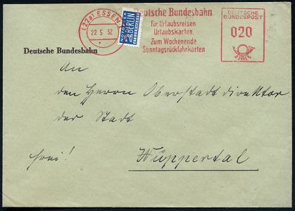 7418 | 15 € | 4300 Essen Absender-Freistempel : (22a) ESSEN 1/ Deutsche Bundesbahn/ für Urlaubsreisen../ Sonntagsrückfahrkarten 1952 (22.5.) AFS Francotyp "Posthorn" auf 2 Pf. NoB = Vorausentwertung , Dienst-Bf.: Deutsche Bundesbahn, rs. Abs.-2L: Personalbüro der/ Eisenbahndirektion Essen (Dü.E-23CG) | ![]() ![]() | |