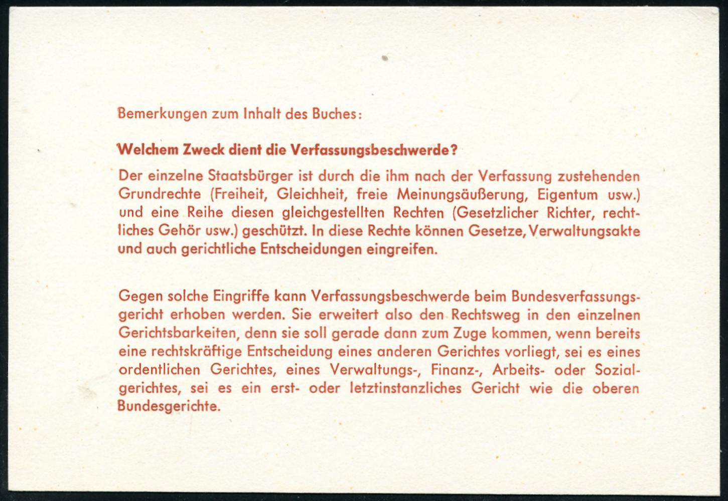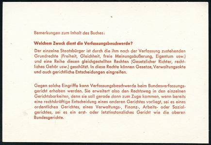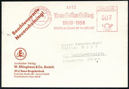 7422 | 18 € | 4300 Essen Absender-Freistempel : (22a) ESSEN-BERGEBORBECK 1/ Hans-Soldan-Stiftung/ 1908-1958/ 50 Jahre im Dienste der Anwaltschaft 1959 (4.2.) Jubil.-AFS Francotyp "Posthorn" mit alter Zählnr. auf Firmen-Kt.: Juristischer Verlag, W. Ellinghaus & Co... mit Werbung für das Buch "Welchem Zweck dienst die Verfassungsbeschwerde?", seltener Beleg! (Dü.E-23CHh) | ![]() ![]() | |