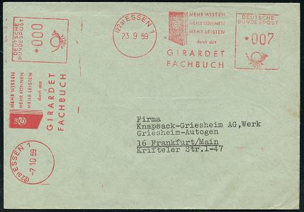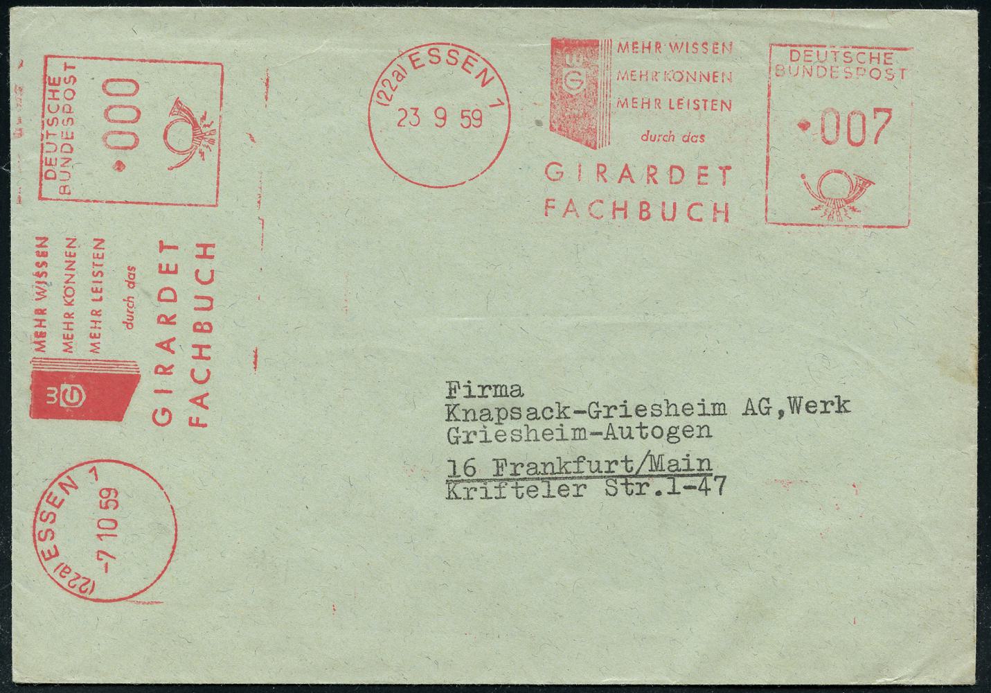 7423 | 12 € | 4300 Essen Absender-Freistempel : (22a) ESSEN 1/ MEHR WISSEN/ MEHR KÖNNEN/ MEHR LEISTEN/ GIRARDET/ FACHBUCH 1959 (23.9.) AFS Francotyp 007 Pf. + 000 Pf. (Buch) rs. Abs.-Vordruck, Fern-Bf. (Dü.E-23DO) | ![]() ![]() | |