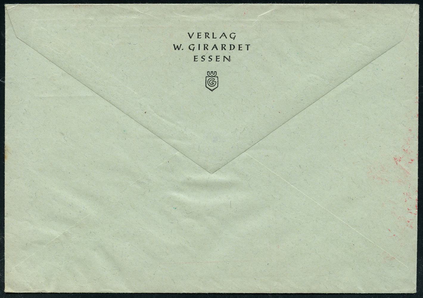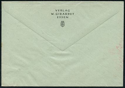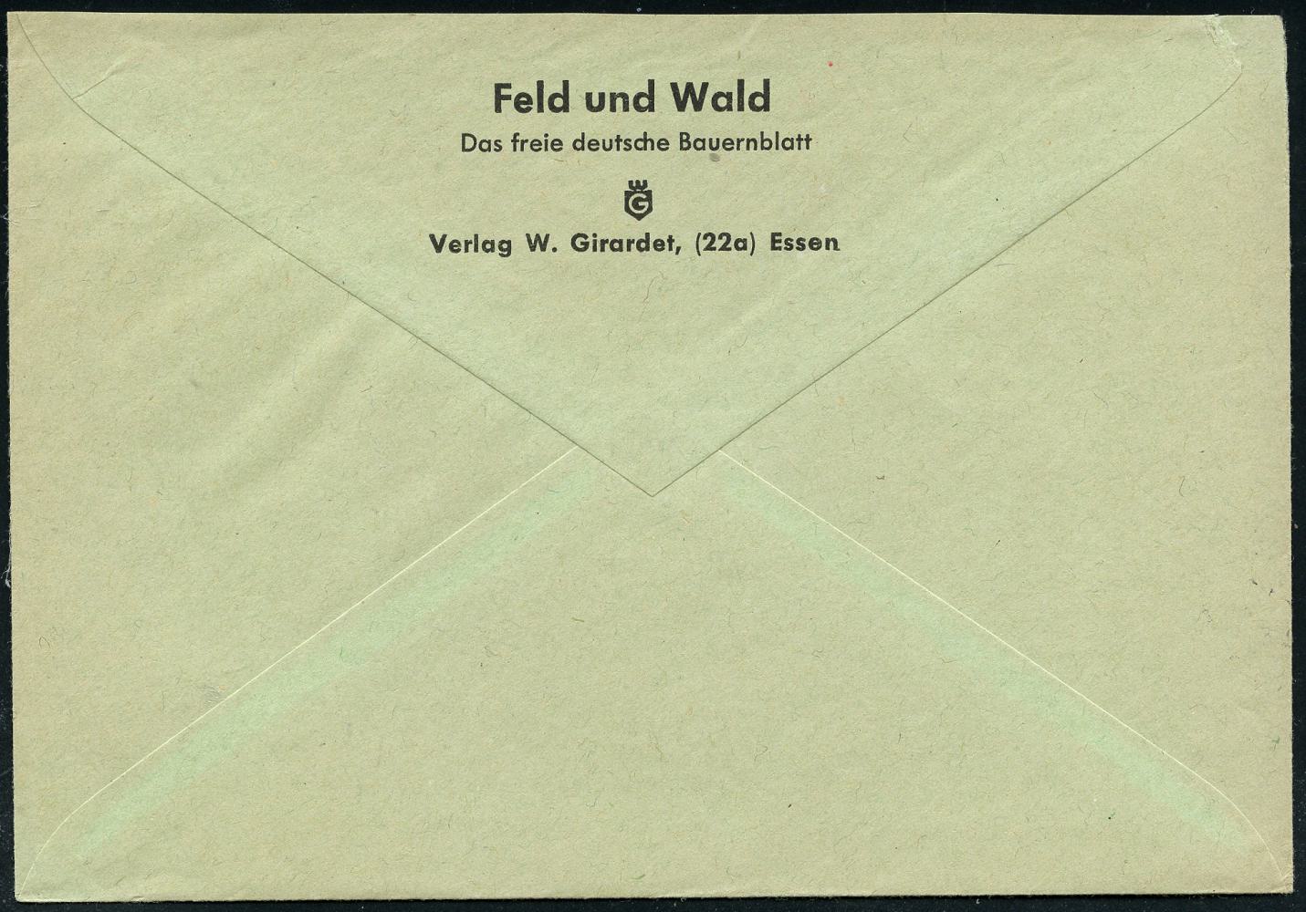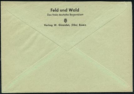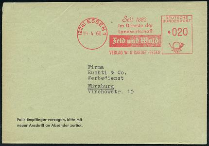 7424 | 10 € | 4300 Essen Absender-Freistempel : (22a) ESSEN 1/ Seit 1882/ ..Feld u. Wald/ VERLAG W.GIRARDET.. 1960 (14.4.) AFS Francotyp , rs. Abs.-Vordruck, Fern-Bf. (Dü.E-23DO) | ![]() ![]() | |