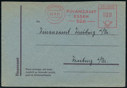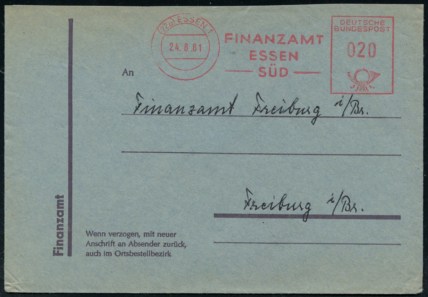 7426 | 16 € | 4300 Essen Absender-Freistempel : (22a) ESSEN 1/ FINANZAMT/ ESSEN/ SÜD 1961 (24.8.) AFS Francotyp "Posthorn", verkürzte Spezialtype! , Fern-Dienst-Bf. (Dü.E-23CO, Nr.392o) | ![]() | |