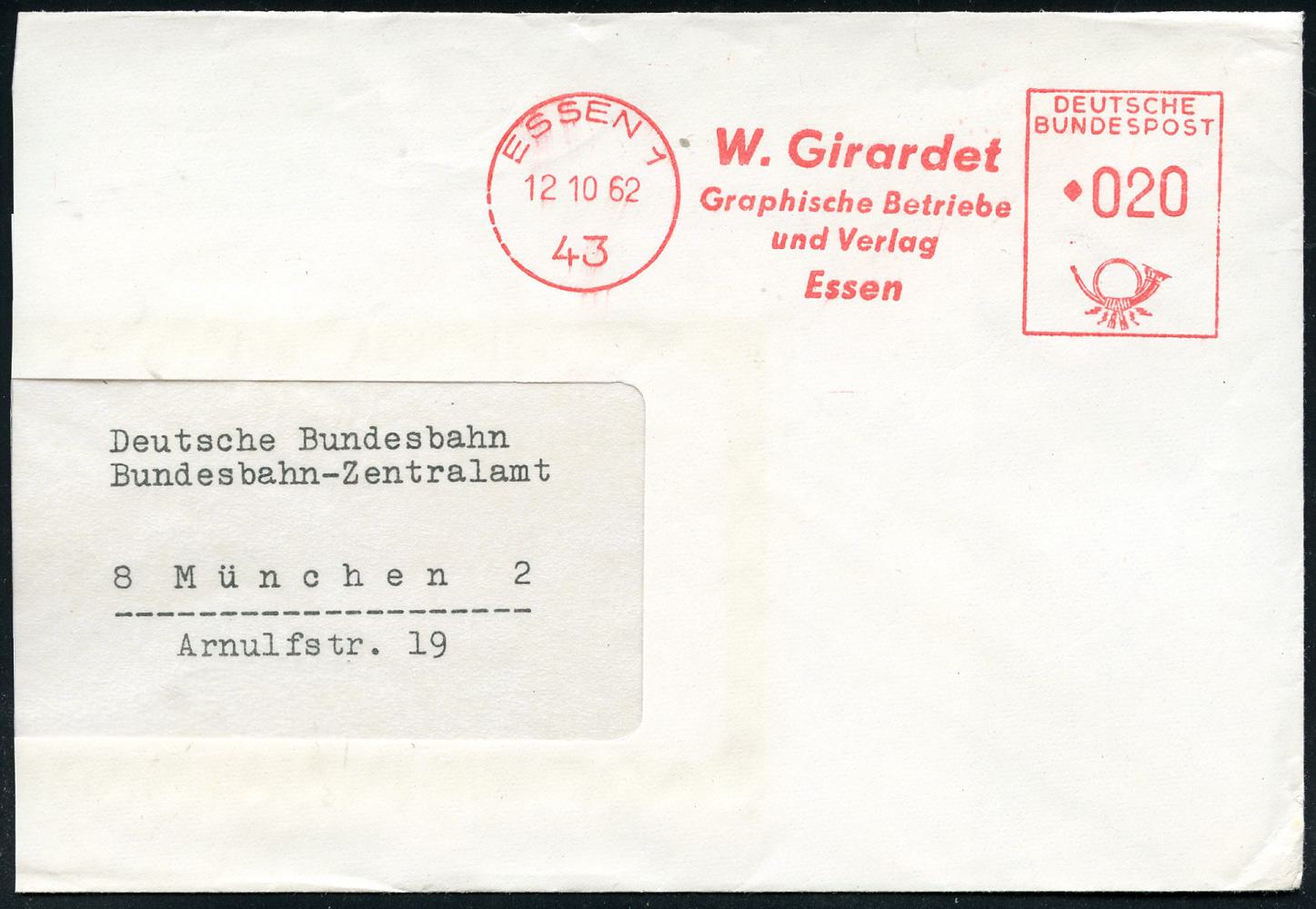 7428 | 10 € | 4300 Essen Absender-Freistempel : 43 ESSEN 1/ W.Girardet/ Graphische Betriebe/ u.Verlag.. 1962 (12.10.) AFS Francotyp, Sondertype Orts-1K mit kleiner PLZ , klar gest. Teil-Bf. (Dü.E-23DO, Sondertype, nur kurze Verwendungszeit) | ![]() | |