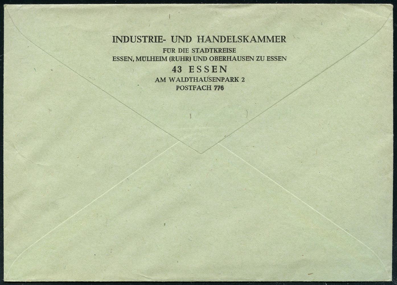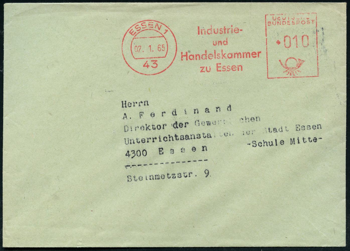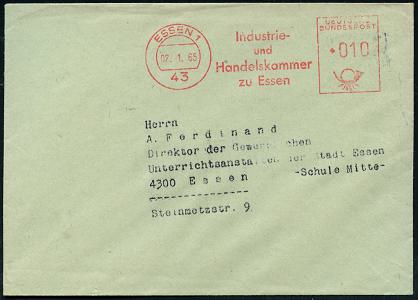 7431 | 8 € | 4300 Essen Absender-Freistempel : 43 ESSEN 1/ Industrie-/ und/ Handelskammer.. 1965 (7.1.) AFS Francotyp , rs. Abs.-Vordruck, Orts-Bf. (Dü.E-23DO) | ![]() ![]() | |